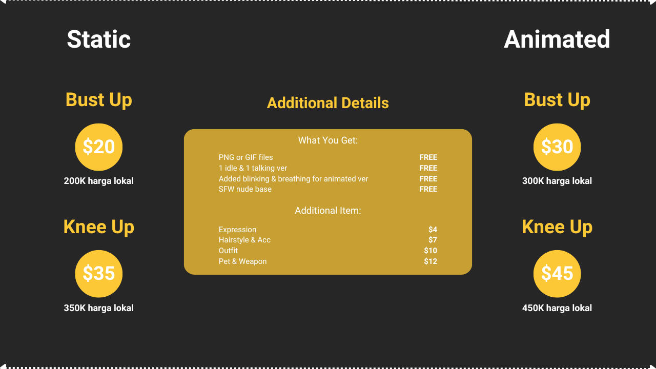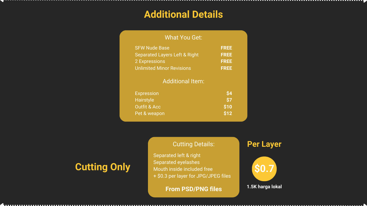 - If clients require the raw PSD/CMO3 files (except for Live2D Model commissions), an additional fee of 30% of the total price will be charged.